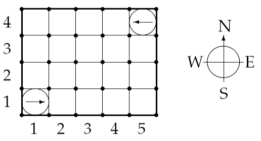 로봇들의 초기 위치는 x좌표와 y좌표로 나타난다. 위의 그림에서 보듯 x좌표는 왼쪽부터, y좌표는 아래쪽부터 순서가 매겨진다. 또한 각 로봇은 맨 처음에 NWES 중 하나의 방향을 향해 서 있다. 초기에 서 있는 로봇들의 위치는 서로 다르다.