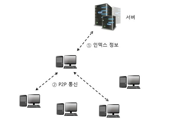 - 중앙 서버가 존재하고, 해당 중앙 서버가 중개 및 검색을 제공하지만, 데이터 전송은 피어 간에 주고 받는 형식