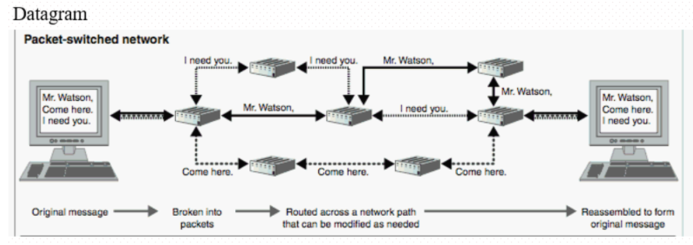 - 여러 개의 패킷이 서로 다른 경로의 네트워크를 거치면서 마지막에목적지에서 전달받는 방식
