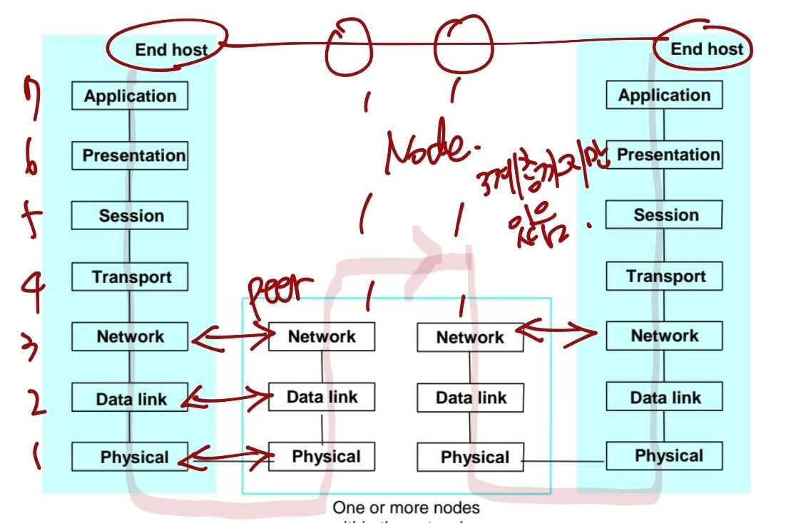 - 네트워크 프로토콜이 통신하는 구조를 7개의 계층으로 분리, 각 계층간의 인터페이스를 정의한 네트워크 표준