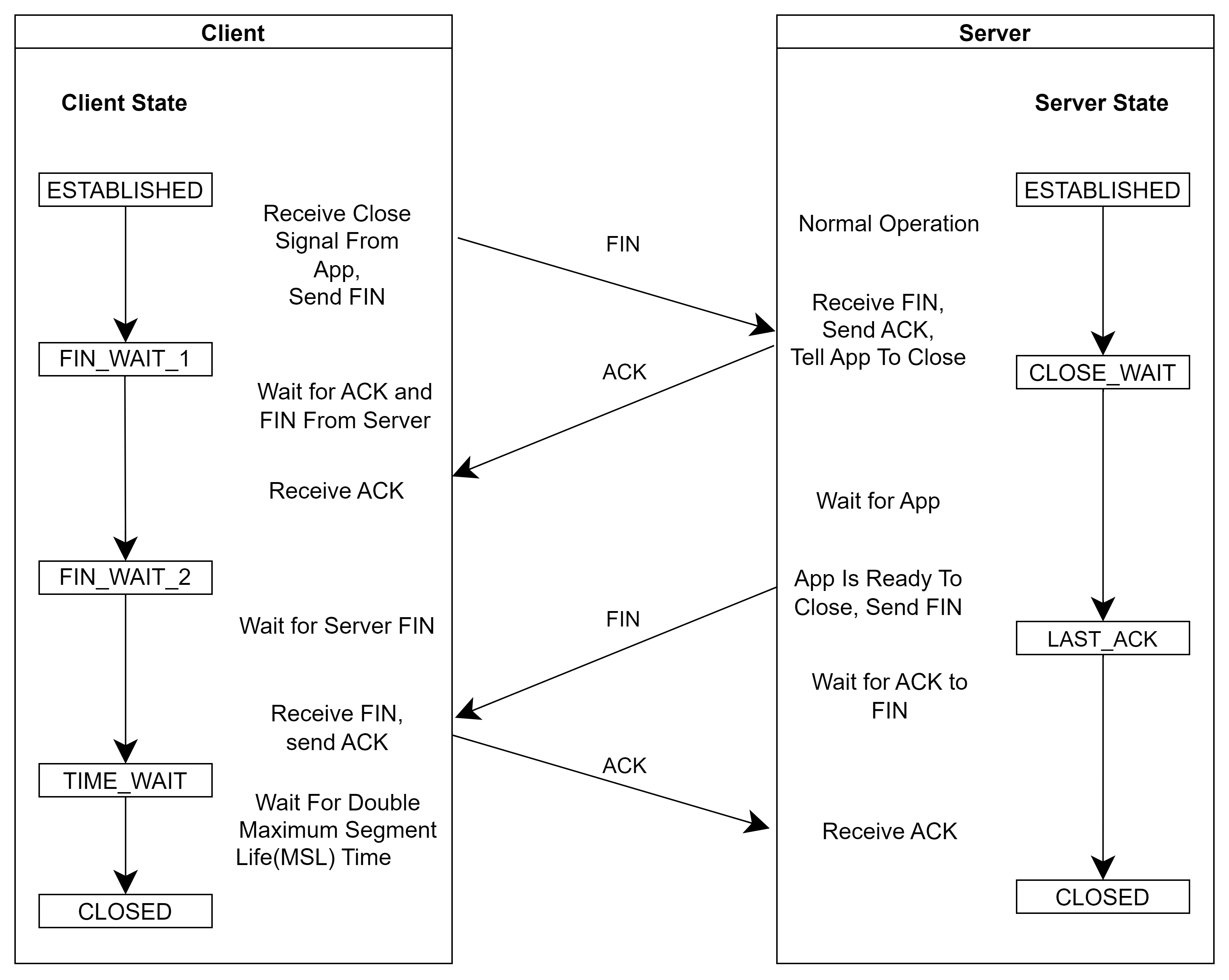 - Active Closer에서 close() System Call을 호출하거나 Activer Closer의 Process가 종료되면, Active Closer가 이용하던 Socket은 Close가 되고 FIN Flag를 상대방에게 전송 후 상태를 FIN_WAIT_1 상태로 변경