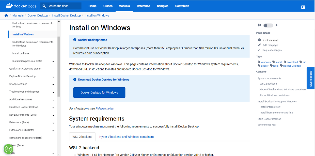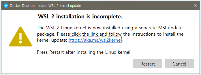 위 링크로 들어가 WSL2 Linux 커널 업데이프 패키지 다운로드 후 설치하고 Docker를 재실행 해본다.