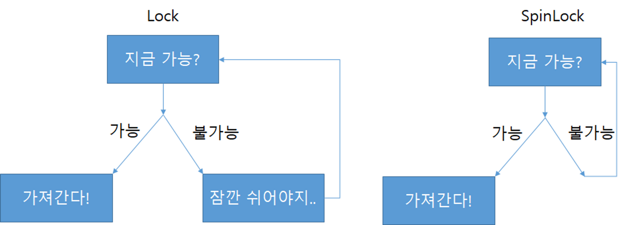 - 권한을 획득하기 전까지 CPU는 Busy waiting 상태로 대기하고 있다가 접근 권한을 얻으면 내부 코드를 수행하고 unlock 진행