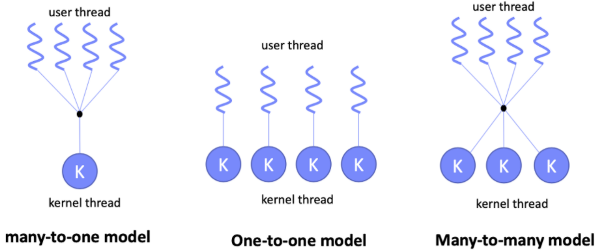 - 커널 스레드는 유저 스레드가 몇개 있는지 모르기 때문에 유저 스레드에서 I/O 작업이 하나라도 발생하면 해당 프로세스는 I/O가 풀릴 때 까지 block 상태가 됨