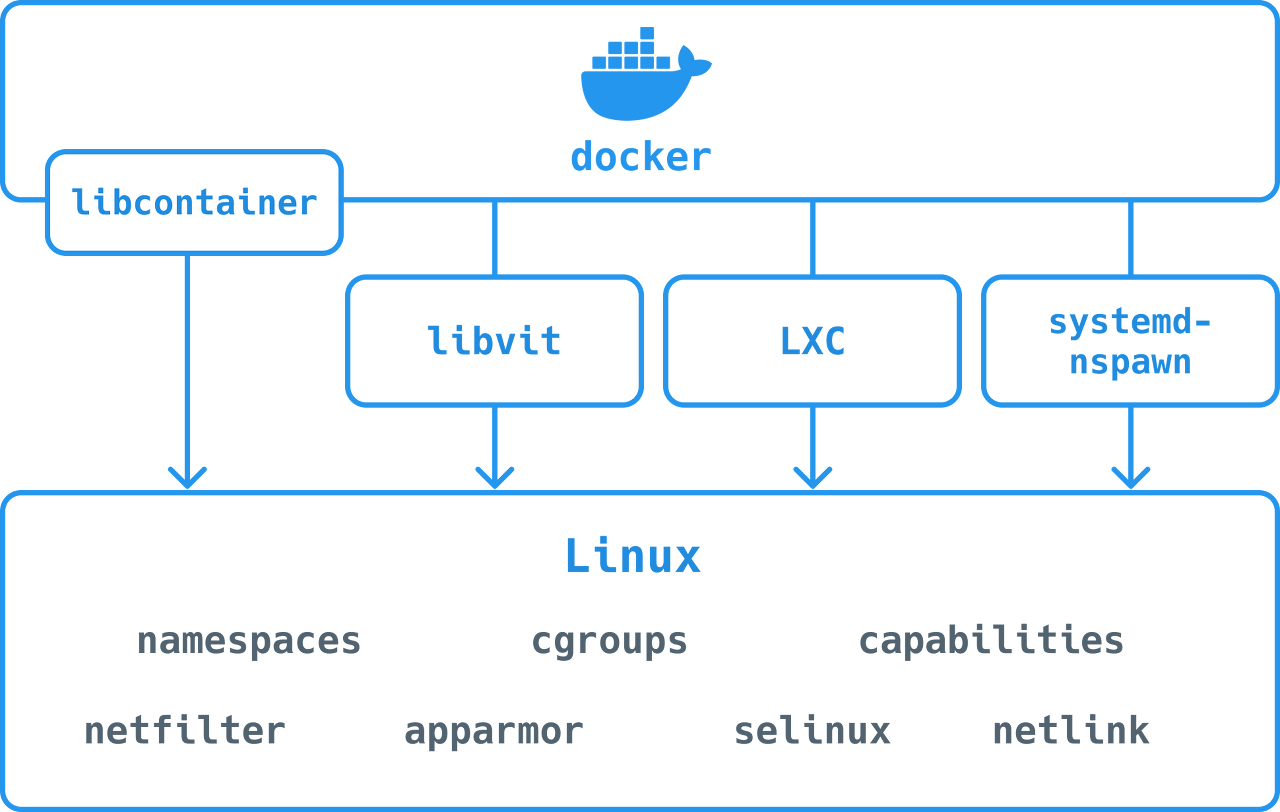 libcontainer, libvit, LXC, systemd-nspawn 모두 도커가 사용할 수 있는 컨테이너 기술이며, 현재 도커는 자체적으로 개발한 libcontainer 를 디폴트로 설정하여 사용하고 있다.