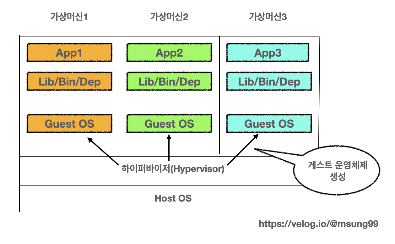 위 그림처럼 가상머신은 애플리케이션과 OS 가 함께 가상화 된 것이다. 따라서 각 가상머신의 Guest OS 는 다른 가상머신들의 Guest OS 와 완전히 독립된 공간과 시스템 자원을 할당받고 사용한다.