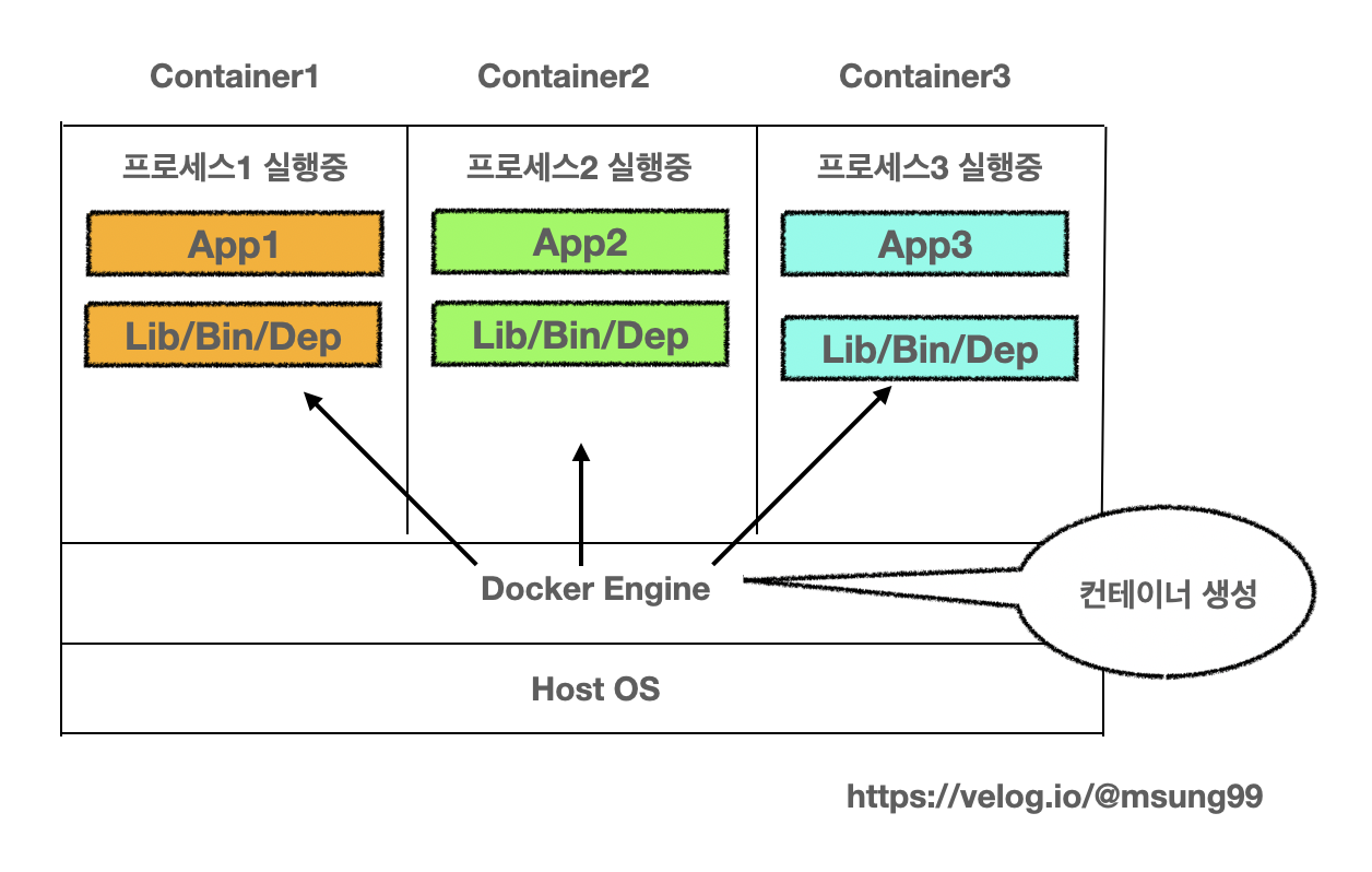 즉 Docker Engine 은 Host OS 는 공유한 상태로 각 도커 이미지를 컨테이너화해서 프로세스들을 격리